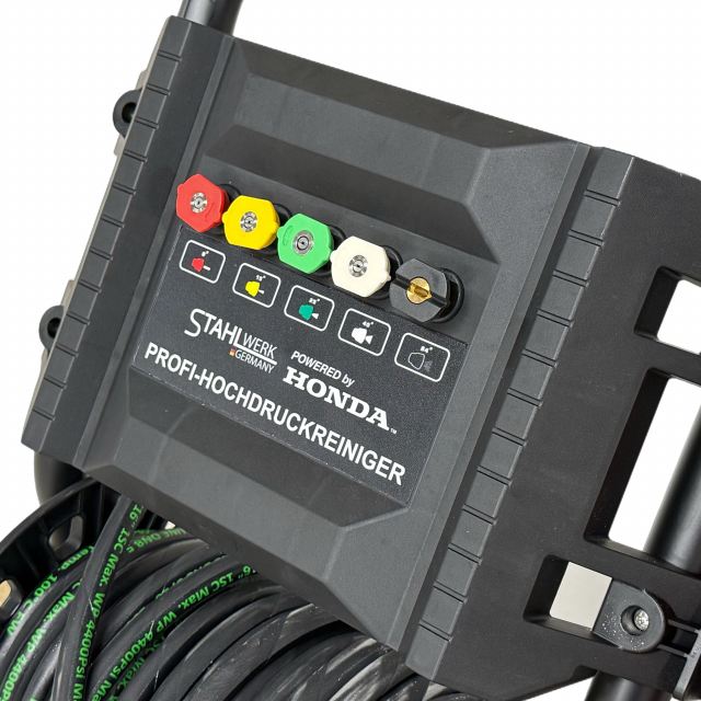 Deze uitvoering bevat bovendien een roterende vuilfrees (rotordüse) – ideaal voor het verwijderen van hardnekkig vuil op beton, bestrating, metaal en andere robuuste oppervlakken.
